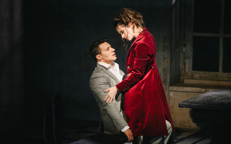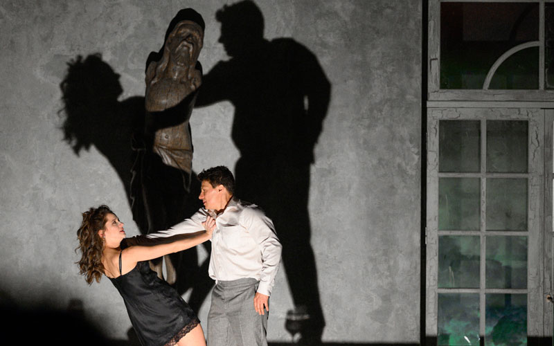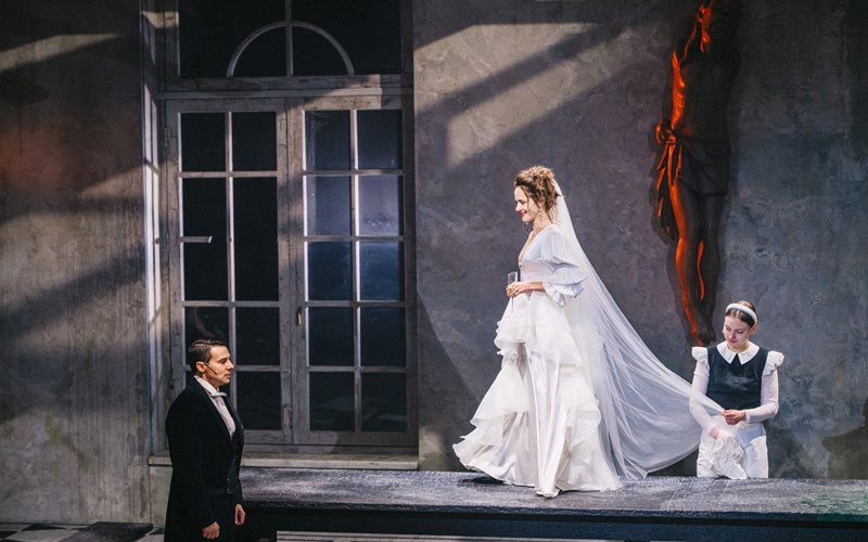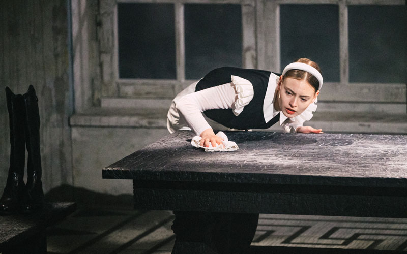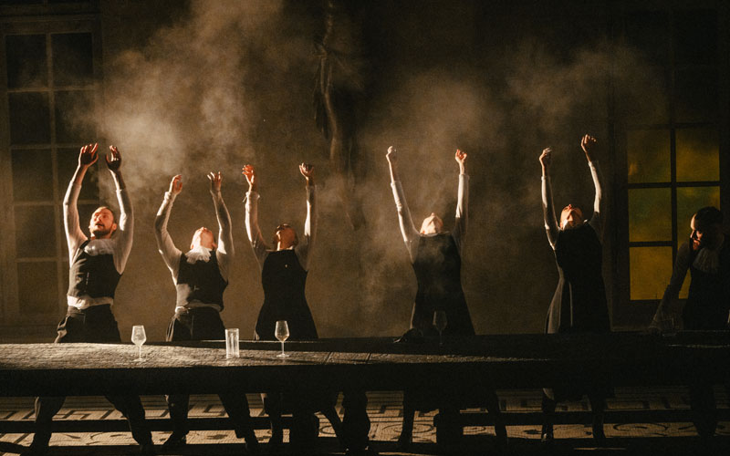 В классической интерпретации «Фрекен Жюли» — это пьеса на троих, но Нобо вводит в спектакль шестерых танцовщиков, которые на манер древнегреческого хора являются немыми свидетелями и незримыми судьями всего, что происходит в эту мистическую ночь на Ивана Купалу. Для режиссера было важно присутствие такого коллективного героя, ведь кем бы ты ни был в этой жизни, за тобой со стороны всегда наблюдает как минимум пара глаз. Современному зрителю, живущему в век социальных сетей, особенно знакомо это ощущение социального вуайеризма.